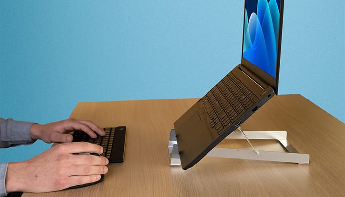 R-Go Riser Basic laptopstativet er med sine 1,2 mm det tyndeste laptopstativ på markedet. Stativet kan nemt justeres i højden i 3 positioner, så du altid kan arbejde i øjenhøjde. På den måde holdes hovedet i en naturlig position, hvilket mindsker spændinger i nakke- og skuldermusklerne.